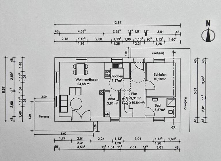 Wandoberflächen: Tapete Rauhfaser, weiß gestrichen, Bad und WC in Teilbereichen gefliest, Maße