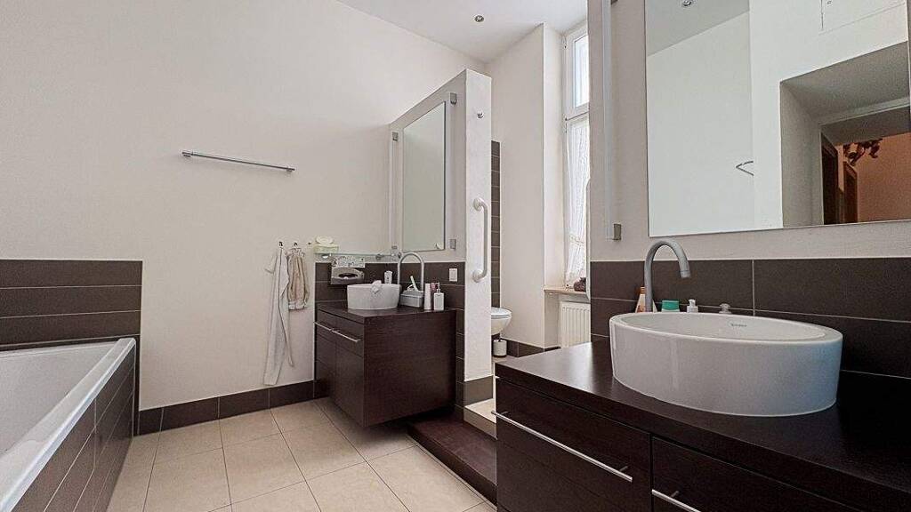 Das großzügiges Tageslichtbadezimmer überzeugt mit bodentiefer Dusche, einer Badewanne, WC und zwei Waschtischen. Das Raumangebot wird durch ein Gäste-WC sowie eine separate, funktional gestaltete Waschküche innerhalb der Wohnung ergänzt.