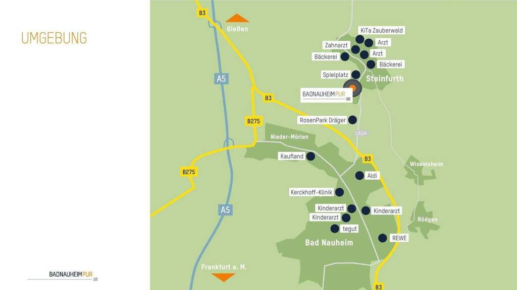 Die schnelle Anbindung an verschiedene Großstädte über den nahegelegenen Bahnhof und die A5 macht Steinfurth besonders attraktiv für alle, die das urbane Leben in Reichweite behalten, aber einen Lebensmittelpunkt suchen, der auf Ruhe, Stil und Verlässlichkeit setzt.