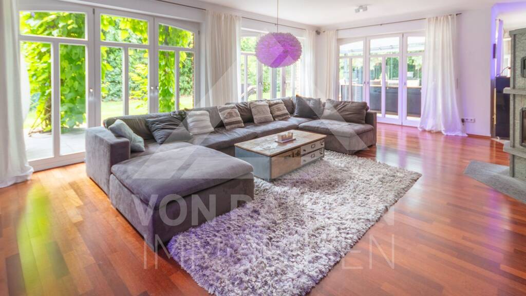 Der weitläufige Garten lädt mit seiner großen Terrasse, der Sauna sowie dem hübsch angelegten Garten mit großem Baum- und Pflanzenbestand zum Verweilen im Freien ein.