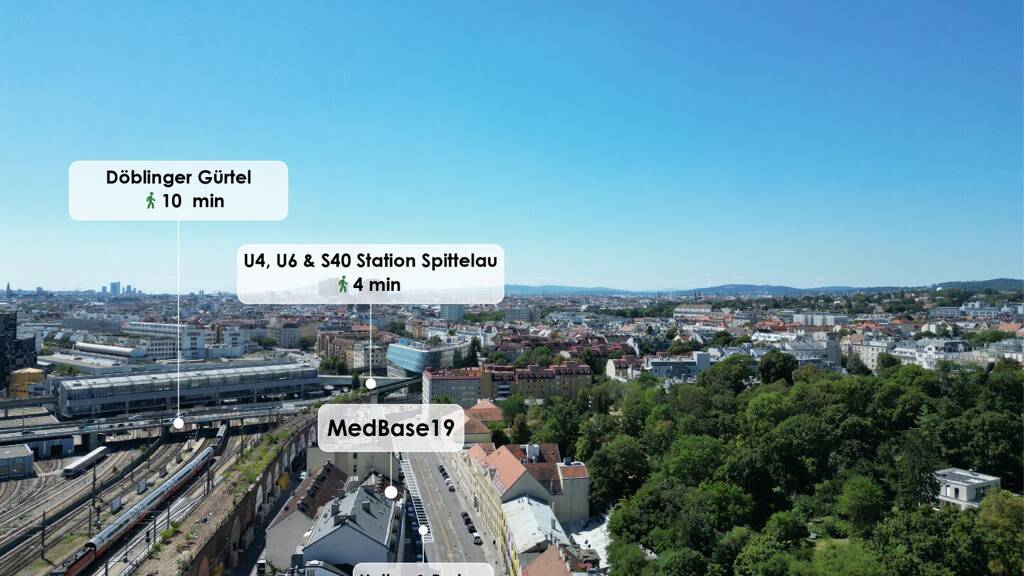 An der Adresse Heiligenstädter Straße 38, direkt gegenüber der Privatklinik Döbling, befindet sich das MedBase19, welches auf 4 Geschoßen zahlreiche Ordinationseinheiten bietet. Die äußerst repräsentative Lage auf der Heiligenstädter Straße direkt gegenüber der Privatklinik, nur 4 Gehminuten von der U4/U6 Station Spittelau sowie der Straßenbahnhaltestelle D entfernt und in unmittelbarer Nachbarschaft zahlreicher Betriebe und Büros, garantiert hohe Frequenz und beste Patienten-Zielgruppen.