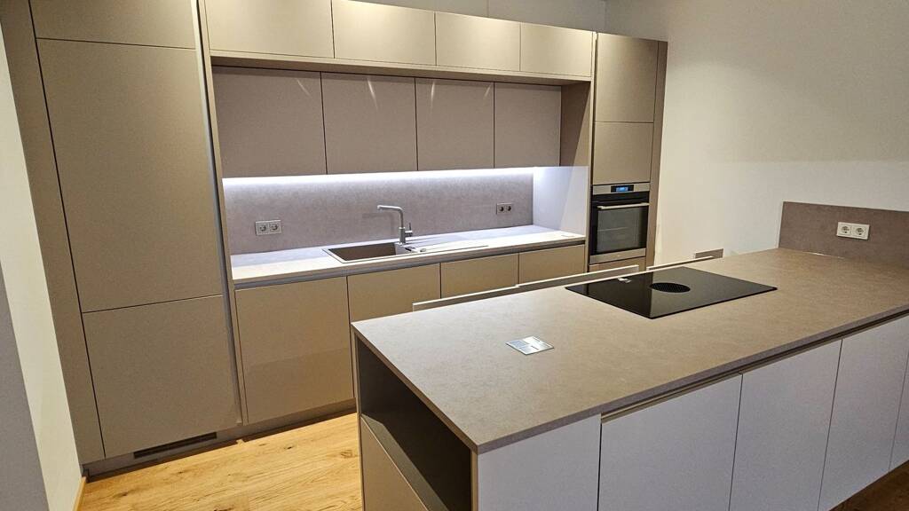 Herzstück des Penthouse ist der großzügige Wohn und Küchenbereich. Offen gestaltet, lichtdurchflutet und mit einem direkten Zugang über eine Schiebetür zum Balkon entsteht hier ein Wohnmittelpunkt mit besonderer Ausstrahlung. Der Balkon erweitert den Lebensraum auf elegante Weise nach außen und lädt dazu ein, entspannte Stunden im Freien zu genießen. Die hochwertige Einbauküche ist großzügig ausgestattet und fügt sich ideal in das moderne Gesamtbild der Wohnung ein.