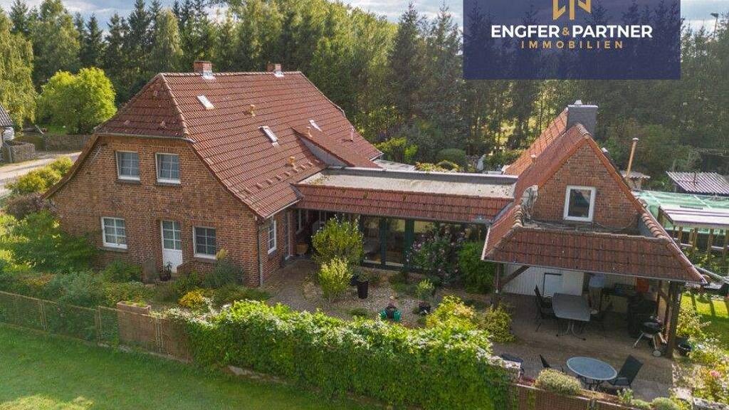 Diese charmante Haushälfte überzeugt mit einer zeitlos schönen Backsteinfassade, einem großzügigen Grundstück von rund 1.236 m² und einem Wohnambiente, das sofort Wohlgefühl vermittelt. Das ursprünglich um 1932 errichtete Gebäude wurde ab 1994 umfassend kernsaniert und seither fortlaufend modernisiert. Durch einen gelungenen Anbau wurde das Haupthaus mit dem ehemaligen Wirtschaftsgebäude verbunden, wodurch ein harmonisches und zugleich funktionales Raumkonzept mit vielfältigen Nutzungsmöglichkeiten entstand. Auf einer Wohnfläche von ca. 144 m² stehen insgesamt sieben Zimmer und drei Bäder zur Verfügung, darunter fünf Schlafzimmer - ideal für Familien mit Kindern, Gäste oder auch für die Kombination aus Wohnen und Arbeiten. Im Erdgeschoss befinden sich ein heller Wohn- und Essbereich mit gemütlicher Atmosphäre, eine gepflegte, funktionsfähige Küche sowie ein Wannenbad. Der angrenzende Wintergarten (Anbau/Verbindung) mit großflächigen Fensterfronten schafft eine wunderbare Verbindung zum Garten und bietet das ganze Jahr über einen lichtdurchfluteten Aufenthaltsort. In den Dachgeschossen befinden sich weitere Schlafzimmer, die teilweise durch sichtbare Holzbalken ein behagliches Raumgefühl erzeugen. Insgesamt präsentiert sich das Haus in einem sehr gepflegten Zustand und verbindet gekonnt den Charme eines historischen Landhauses mit zeitgemäßem Wohnkomfort. Das weitläufige Grundstück bietet vielfältige Gestaltungsmöglichkeiten und ausreichend Platz für Familie, Gartenfreunde oder Tierhaltung. Neben einer großzügigen Rasenfläche gibt es ein Gewächshaus, angelegte Beete und eine überdachte Terrasse, die zum Entspannen, Grillen oder geselligen Beisammensein einlädt. Ergänzt wird das Angebot durch ein weiteres Wirtschaftsgebäude mit praktischer Abstellfläche, in dem sich auch die Holz- und Ölheizung befindet - ideal zur Unterbringung von Gartengeräten, Werkzeugen oder Brennstoff. Eine Doppelgarage, zusätzliche Außenstellplätze sowie ein Teilkeller runden das Angebot ab.