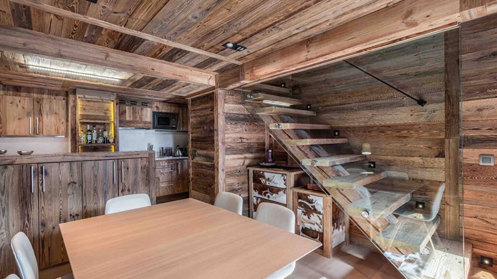 The heart of the apartment is a magnificent cathedral-style living room, flooded with natural light and enhanced by impressive ceiling height and a fireplace-perfect for cosy evenings after a day on the slopes.