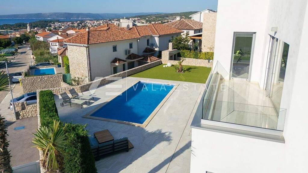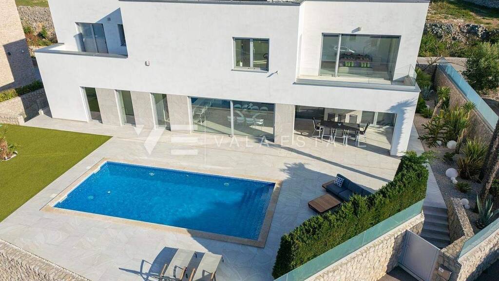 Immobilien auf der Insel Krk, Stadt Krk - zu verkaufen ist eine neue Luxusvilla in ruhiger Lage 500 m vom Meer und wunderschönen Stränden entfernt. Die Villa wurde 2016 in hochwertiger Bau- und Ausstattungsqualität erbaut, verfügt über Fußbodenheizung und -kühlung im gesamten Haus, einen Kamin, Videoüberwachung, hochwertige Aluminium-Tischlerei, Keramik und Sanitärkeramik in Top-Qualität, eine Solaranlage zur Warmwasserbereitung und für den Pool, eine Alarmanlage, Sicherheitstüren und eine Video-Gegensprechanlage. Es erstreckt sich über drei Etagen und bietet eine Gesamtwohnfläche von 400 m2. Im Untergeschoss befinden sich zwei Abstellräume, die als Wellnessbereich genutzt werden können, eine Toilette und ein großer Raum mit Küche und Grill mit Zugang zu einer überdachten Terrasse. Das Erdgeschoss umfasst einen Eingangsbereich, eine Toilette, eine Küche mit Essbereich und ein geräumiges Wohnzimmer mit Zugang zu einer überdachten Terrasse. Im ersten Stock gibt es eine Waschküche und drei weitere Schlafzimmer, jedes mit eigenem Bad, Kleiderschrank und Zugang zu einer Terrasse mit wunderschönem Blick auf das Meer. Der wunderschön angelegte und eingezäunte Garten, der Privatsphäre bietet, verfügt über einen beheizten Swimmingpool, eine Liegewiese, einen Gartengrill, automatische Bewässerung, drei Parkplätze und eine große Garage für zwei Autos. Dieses ausgezeichnete Anwesen ist ideal für alle Liebhaber eines luxuriösen und ruhigen Urlaubs.