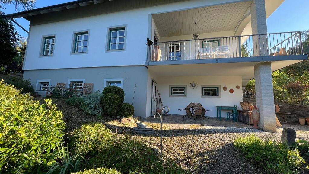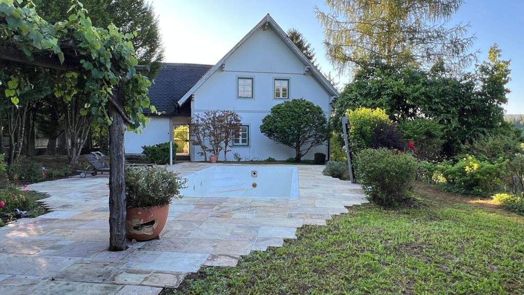Die gepflegte Liegenschaft befindet sich in erhöhter Lage mit einem wunderschönen Ausblick. Sie besticht vor allem durch ihren von der Gärtnerei Lederleitner in Terrassen gestalteten Garten mit beleuchteten Wegen, einem Pavillon, ein Biotop und zahlreichen Sitzgelegenheiten. Die große Terrasse mit dem Pool (mit Gegenstromanlage und Außendusche) und einer Laube laden zum Sitzen und Verweilen ein.