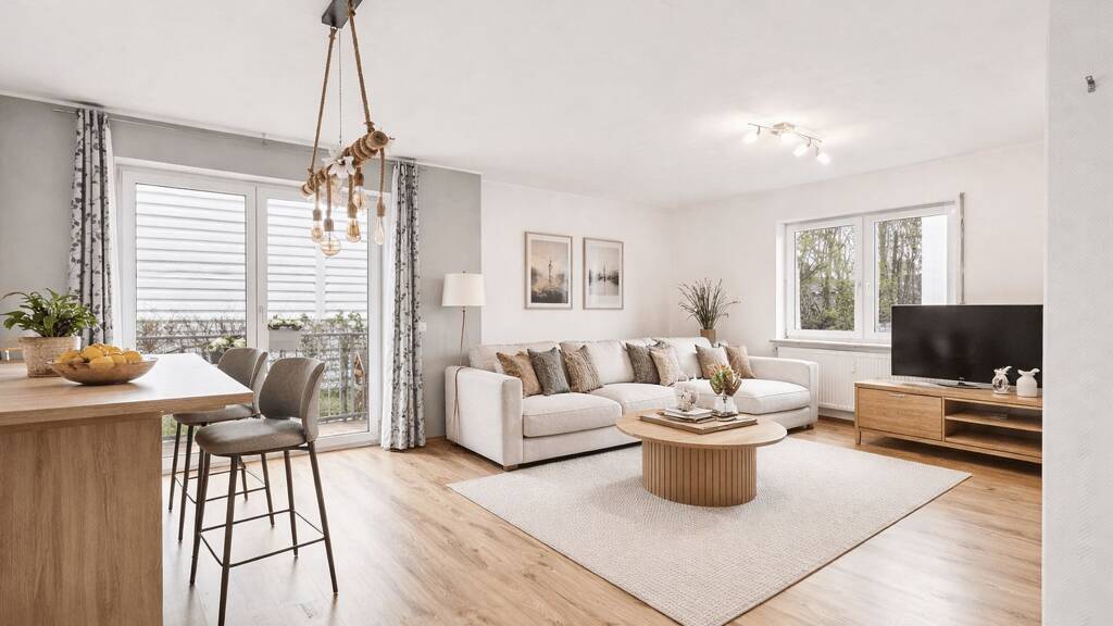 Der helle Wohnbereich bildet das Herzstück der Wohnung und bietet direkten Zugang zum Balkon, der zu entspannten Stunden im Freien einlädt. Hier lassen sich sowohl ruhige Momente als auch gesellige Abende mit Familie und Freunden genießen.