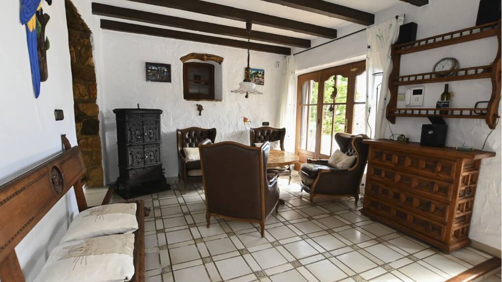 Das großzügige 49 m² Wohnzimmer besitzt einen offenen Kamin, um gemütlich den Tag ausklingen zu lassen. Das gesamte Haus wurde mit teils Antiken handgeformten und charakteristischen spanischen Fliesen ausgestattet. Ein 25 m² großes Doppelzimmer mit Klimaanlage, Ausgang zum Balkon und eigenem Bad mit Dusche, Bidet, Waschbecken und WC.