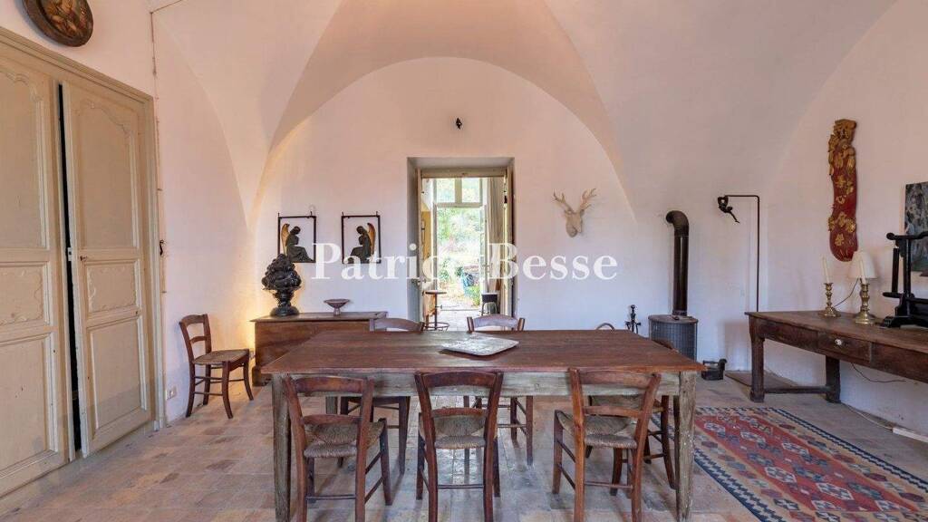 The entrance door leads into a spacious hallway with a groin-vaulted ceiling. This hall connects to the different reception rooms on the ground floor. These reception rooms connect to each other. First, there is a former kitchen with a floor and walls of dressed stone. Next, there is a large dining room. Like the kitchen, it has a groin-vaulted ceiling and a floor of old terracotta tiles. Further on, there is a large lounge with a stone fireplace. This south-facing lounge leads to an old chapel, which has been turned into an office. Then there is a reading room with a ...