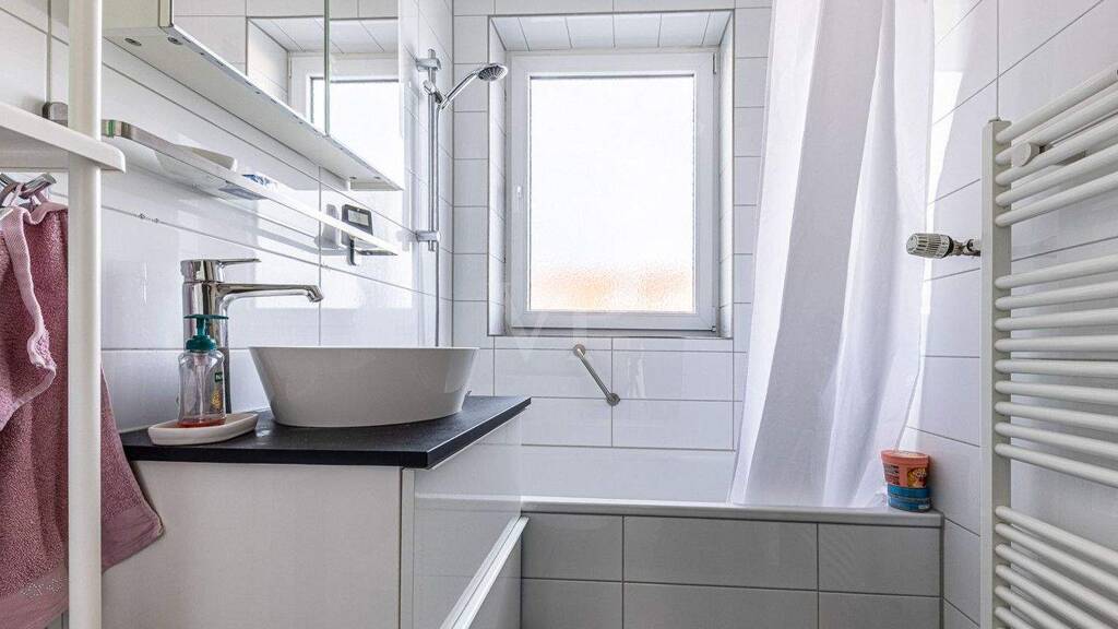 Das stilvolle Wannen-Duschbad fügt sich nahtlos in das hochwertige Gesamtkonzept ein. Eine Fußbodenheizung sorgt in allen Räumen für angenehme Wärme, die individuell regulierbar ist. Zusätzlich stehen klassische Heizkörper für ein komfortables Raumklima bereit. Der lichtdurchflutete Wohn- und Essbereich bietet viel Raum zum Entspannen und führt auf den nach Süden ausgerichteten Balkon - ideal, um sonnige Tage zu genießen.