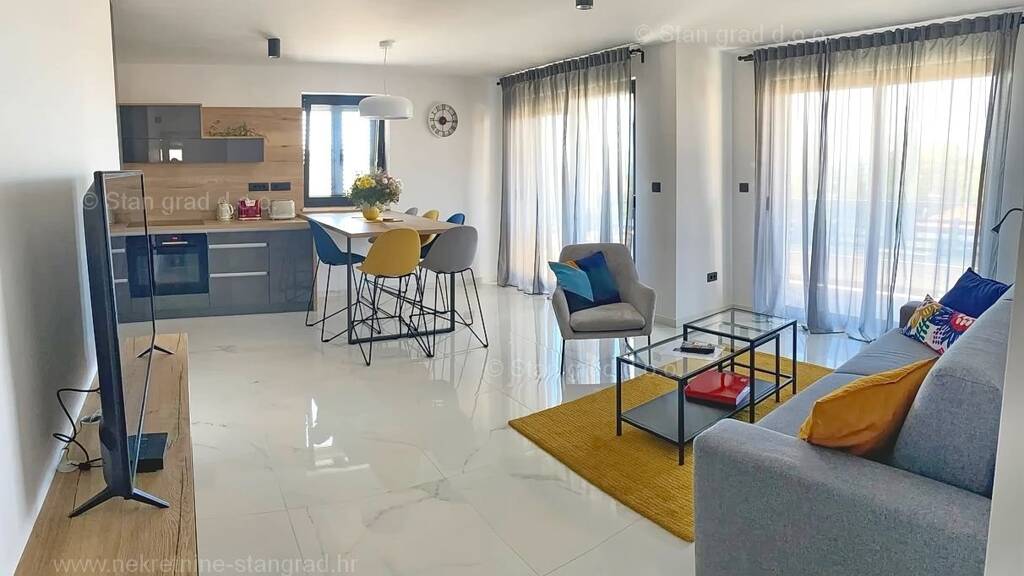 Im Immobilienangebot der Agentur Stan Grad Immobilien auf der Insel Krk gibt es eine sehr attraktive Wohnung, die sich perfekt für einen touristischen Aufenthalt und Urlaub an der Adria eignet. Die betreffende Wohnung fügt sich harmonisch in die charakteristische Küstenumgebung ein und bietet einen bequemen Fußweg zum Strand und Zugang zu allen Annehmlichkeiten im Zentrum von Punat. In der Natur handelt es sich um eine sehr geräumige und komfortable einstöckige Wohnung. Im Inneren des luxuriös gebauten Gebäudes befindet sich die Wohnung im Erdgeschoss. Die Gesamtfläche dieser Wohnung beträgt 77 m2. Im genannten Bereich befinden sich eine Eingangshalle, ein Wohnzimmer und eine Küche mit Esszimmer, 2 Schlafzimmer, ein Badezimmer, eine Toilette und eine überdachte Terrasse. Im äußerst gepflegten und luxuriös ausgestatteten Innenbereich des Objekts wurde ein reichhaltiger Gerätesatz der neuesten Generation verbaut. Erwähnenswert ist sicherlich, dass zum Eigentum der beschriebenen Wohnung auch ein gepflegter Garten mit beheiztem Pool und die Möglichkeit der Nutzung eines gemeinschaftlichen Grills gehört. Dem Eigentümer der Wohnung stehen zwei Parkplätze zur Verfügung. Zusätzlich zu den bisherigen Merkmalen ist das Gebäude perfekt ausgerichtet, sodass die Wohnung einen wunderbaren Blick auf das Meer und die Küste bietet. Diese Wohnung unterliegt der Mehrwertsteuer. Der Verkäufer garantiert die Ordnungsmäßigkeit der relevanten technischen und Eigentumsdokumente sowie die Möglichkeit einer schnellen und reibungslosen Eigentumsübertragung der Wohnung an den Käufer. Unsere Mitarbeiter sorgen dafür, dass Sie sich in der Kvarner-Bucht wie zu Hause fühlen. Besuchen Sie uns auf der Insel Krk. Neben der Suche und Präsentation der für Sie idealen Immobilie unterstützt Sie unser Maklerbüro bei der Übertragung von Nebenkostenabrechnungen und der Anmeldung des Wohnungseigentums.