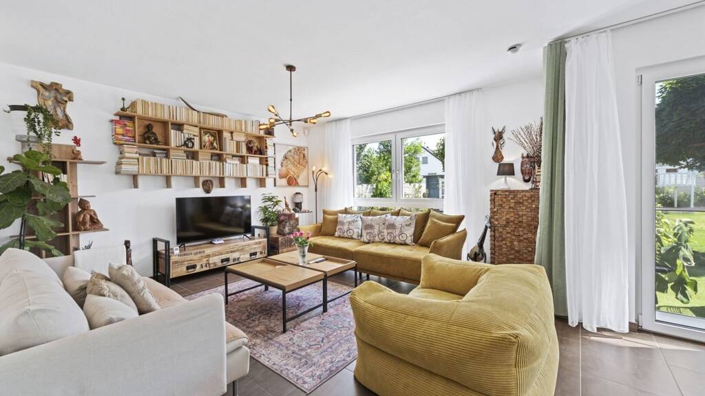 Das Herzstück des Hauses ist der zentrale Wohnbereich mit integrierter, räumlich leicht nach hinten versetzter Küche und Ausgängen auf die Terrasse sowie in den herrlichen Wintergarten. Auf insgesamt rund 46m2 ist ausreichend Platz für die Einbauküche samt Kücheninsel, einen großen Esstisch sowie eine gemütlichen Sofa-Landschaft mit TV vorhanden. Abgerundet wird der Wohlfüh-Raum durch einen Schwedenofen und zahlreiche Fensterflächen, die den Blick in den herrlich gestalteten Garten, die vorgelagerte Terrasse und den Wintergarten frei geben.