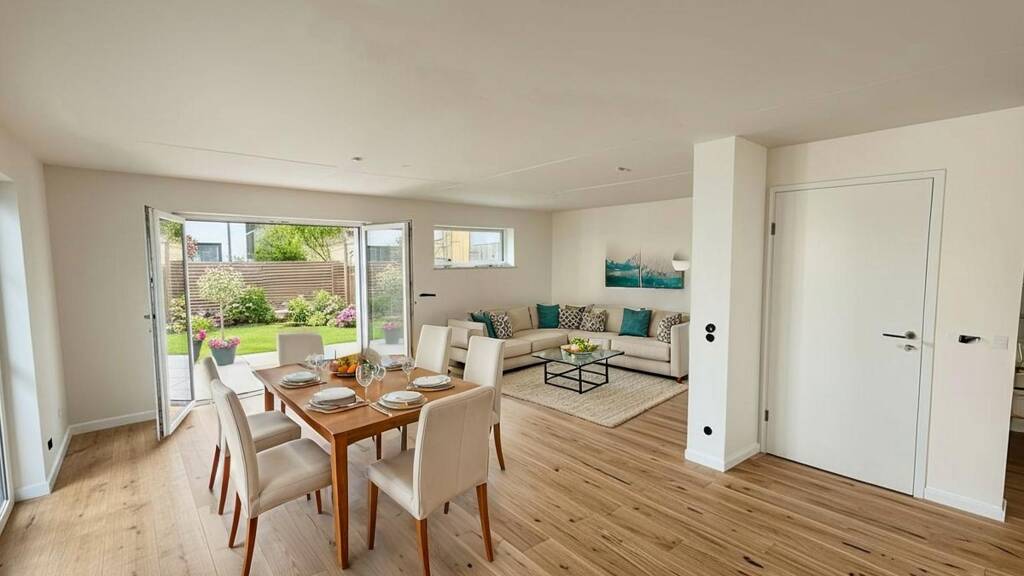 Im Erdgeschoss erwartet Sie eine einladende Diele, ein Gäste-WC sowie ein praktischer Abstellraum mit Waschmaschinenanschluss. Das Herzstück des Hauses bildet der großzügige, offene Wohn-, Ess- und Küchenbereich mit direktem Zugang zur Terrasse und dem Garten - ideal für entspannte Stunden im Freien.