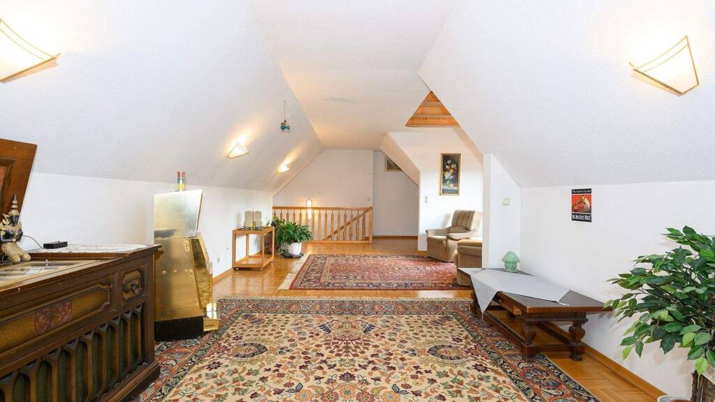 Über die Treppe gelangt man in das Dachgeschoss, wo ein geräumiges Studio mit etwa 38m² Wohnnutzfläche zur Verfügung steht. Dieser offene Bereich eignet sich hervorragend als Homeoffice, Gästezimmer oder zusätzlicher Wohnraum. Seitlich angrenzende Dachbodenflächen bieten zusätzlichen Stauraum.