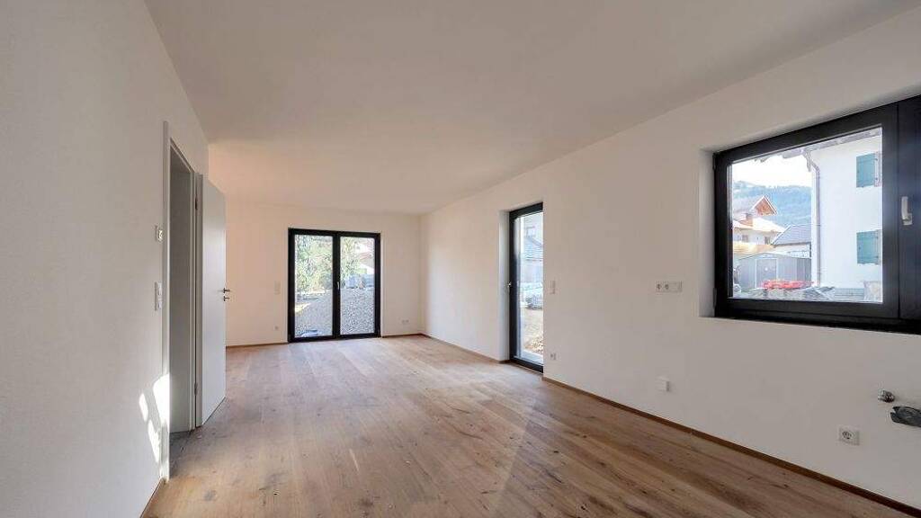 .Großzügiger Wohnbereich mit bodentiefen Fensterfronten und Zugang zur Gartenterrasse .Angrenzender Koch- und Essbereich mit Platz für moderne Kücheneinbauten .Praktischer Vorrats-/Abstellraum .Gäste-WC mit Fenster .Geräumiges Entree mit leicht separierter Garderobe .Ruhige Terrasse