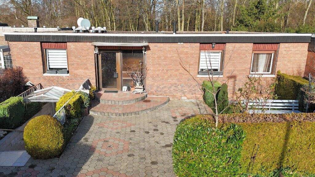 Massiv gebauter 14x14 Meter breiter Reihenbungalow mit zwei separaten Wohneinheiten, der hervorragend auch von einer großen Familie oder zwei Familien bzw. auch von zwei Generationen genutzt werden kann. Im Erd- und Untergeschoss befinden sich jeweils ein großzügiger Wohn-und Essbereich sowie jeweils drei Schlafzimmer so dass genügend Platz für Kinder vorhanden ist.