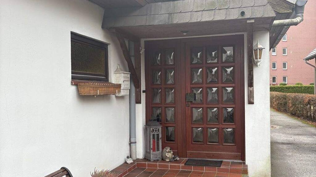 Die Angaben zu der Ausstattung (Zimmeranzahl, Bäder, qm Wohnfl. etc) beziehen sich lediglich auf das Einfamilienhaus im hinteren Grundstücksbereich. Das angebotene Objekt bietet noch freie Gestaltungsmöglichkeiten: im vorderen Bereich des Grundstücks befindet sich ein EFH aus 1949 mit ca. 55 qm und Vollkeller, das allerdings renovierungsbedürftig ist. Eine Sanierung mit Erweiterung des Vorderhauses wäre möglich, man könnte aber auch ein komplett neues Haus auf diesem Grundstücksteil errichten, siehe nähere Erläuterung unter der Rubrik Merkmale. Auch für das ältere Haus liegt ein Energieausweis vor und kann auf Anfrage vorgelegt werden. Die Heizungs- und Warmwasserversorgung erfolgt dort über einen sog Kombi-Wasserheizer. 1970/74 wurde dann von der Familie ein Bungalow im hinteren Bereich des Grundstücks angebaut, der dann 1984 durch die Aufstockung eines Obergeschosses vergrößert wurde. Insofern sind es aktuell 2 Häuser im Verbund. Das hintere Haus hat eine Wohnfläche von ca. 144 qm. Über einen Flurbereich gelangen Sie in die großzügige Diele, von der dann die weiteren Räume, wie Eßzimmer, Einbauküche, Bad und Wohnzimmer abgehen. Von der Diele wurde ein weiterer Raum offen gestaltet, der aber jederzeit wieder mit wenig Aufwand geschlossen werden könnte. (Ideal als z. B. Gäste- oder Arbeitszimmer, hier als 1/2 Zimmer angegeben). Der Eingangs-Dielenbereich sowie die Küche sind hell gefliest, das Eßzimmer hat Laminatboden, das Wohnzimmer, von dem man Zugang zu der teilüberdachten, ca. 18 qm großen Terrasse und dem wunderschönen, geschützten Garten hat, ist mit Parkettfußboden ausgelegt. Für Gemütlichkeit sorgt der dänische Kaminofen (2007). Im Zuge des Einbaus des Ofens wurden auch das Parkett, das Laminat und die Fliesen erneuert. Das Wannenbad wurde in 2000 nochmals modernisiert und ist in einem ausgesprochen gepflegten Zustand. Die Einbauküche ist Baujahr entsprechend, allerdings wurden die Geräte in der Zwischenzeit ausgetauscht. Die Küche bietet ausreichend Platz für eine Eßecke. Bei den Fenstern handelt es sich im ganzen Haus um Mahagoni-Thermopenfenster (EG: 1970, OG 1984). Im OG sind 3 weitere Räume sowie ein Duschbad vorhanden. Die Räume im OG (Duschbad hat Fliesen) sind alle mit Laminat ausgelegt. Vom Schlafzimmer hat man Zugang zu der Loggia, die eine Größe von ca. 8,8 qm hat. Der Brennwertkessel BJ 2006 befindet sich in einem Abstellraum im OG. Im Garten wurde eine weitere teilüberdachte Terrasse mit Grillofen errichtet. Der Garten ist insgesamt sehr geschützt und grenzt im hinteren Bereich wiederum an Gartenfläche. Die Doppelgarage befindet sich seitlich von dem neueren Haus. Im vorderen Bereich des Grundstücks befinden sich momentan mehrere Stellplätze.