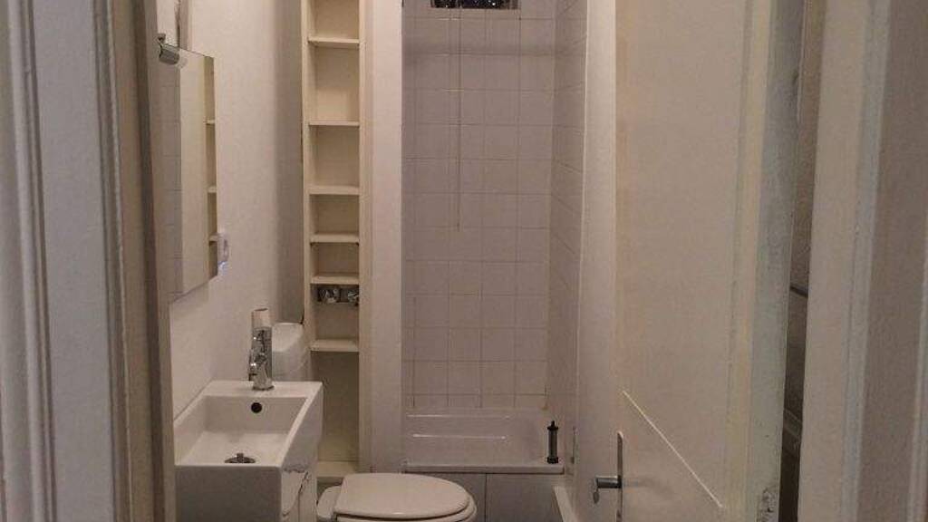 Das Duschbad ist mit einem Fenster ausgestattet. Die Küche dieser Wohnung bietet Platz für einen kleinen Esstisch.