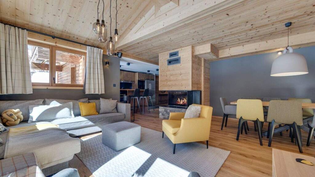 At its heart, a spacious living area seamlessly integrates a fully equipped kitchen, welcoming dining space, and cosy lounge around a beautiful fireplace-perfect for unwinding after a day on the pistes. Large windows open onto a tranquil balcony, where you can savour quiet alpine mornings or sunsets over the snow-kissed peaks.