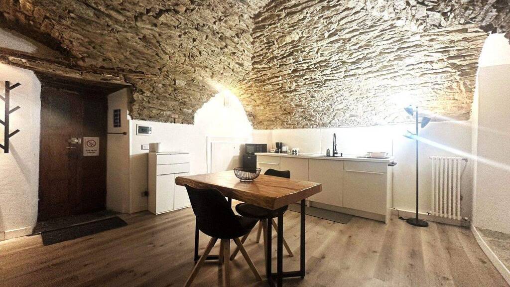 Im Erdgeschoss befindet sich eine Maisonette-Zweizimmerwohnung mit Schlafbereich auf der unteren Ebene und Wohnbereich auf der oberen Ebene, der durch Gewölbedecken mit Bögen und Sichtstein besonders hervorgehoben wird.