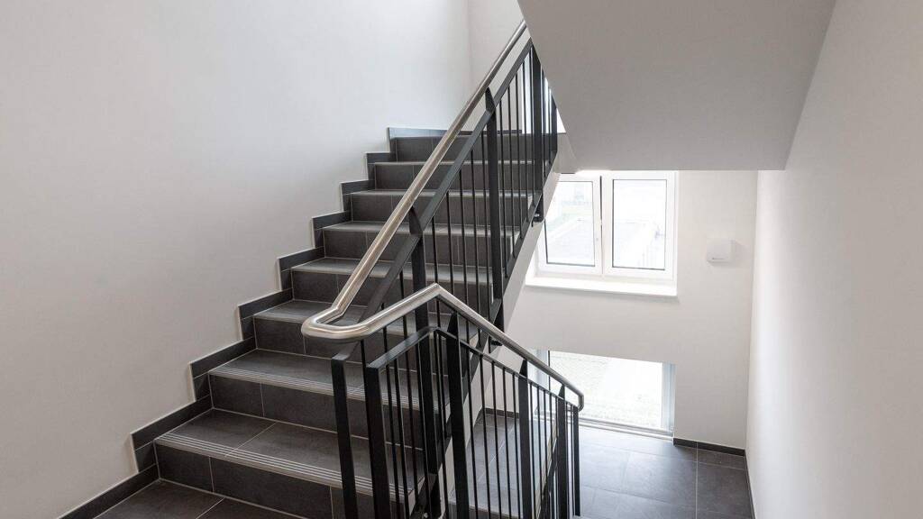 Das Gebäude wurde gemäß dem KfW-55-Effizienzhaus-Standard errichtet, was für eine energieeffiziente und nachhaltige Bauweise steht.