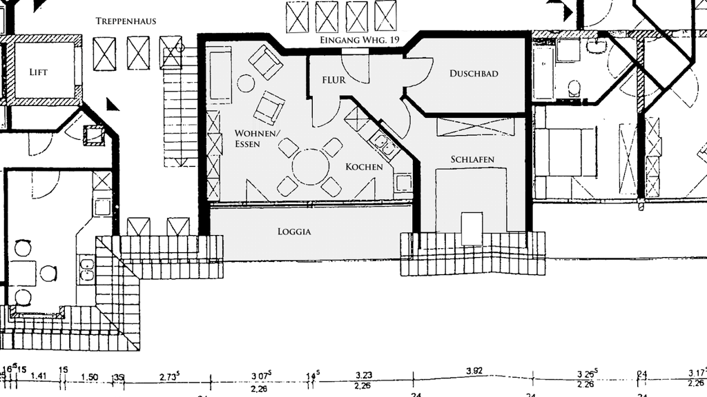 großzügiger Wohn- und Essbereich mit offen gestaltetem Kochbereich, ein großzügiges Schlafzimmer, ein Wohlfühl- Duschbad mit begehbarer Dusche sowie eine einladende Eingangsdiele. Vom Wohn-, Ess- und Kochbereich gelangen Sie zur geschützt liegenden Loggia mit Ausblick in das angrenzende Landschaftsschutzgebiet