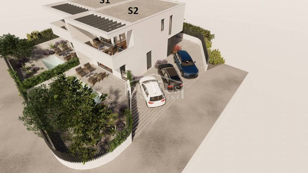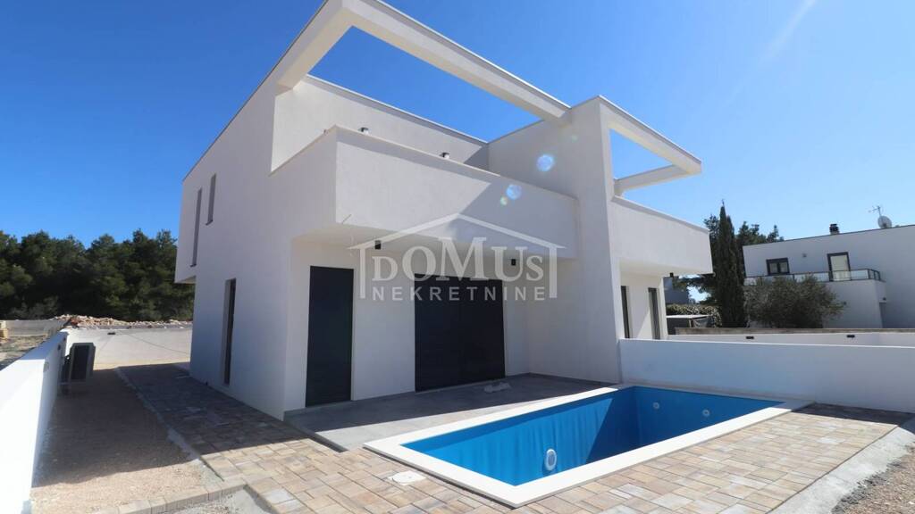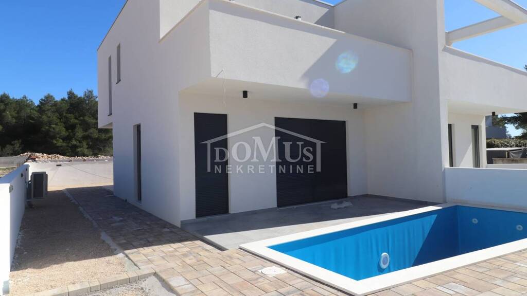 Familienhaus in Srima, 550 m vom Kiesstrand und dem Stadtzentrum entfernt. Das Haus ist ein zweistöckiges Gebäude, auf zwei Etagen EG + 1. Stock mit 117,57 m2 Gesamtnutzfläche und 150 m2 Garten mit großer Terrasse und einem 12 m2 großen Pool. Das Erdgeschoss des Hauses besteht aus einem überdachten Eingang, einem Gäste-WC, einem Flur, einem großen Wohnzimmer mit Küche und einem Esszimmer mit Zugang zu einer überdachten Terrasse mit Swimmingpool und angrenzenden Garten. Im 1.Stock des Hauses befinden sich drei Schlafzimmer, zwei Badezimmer, ein Flur, ein Kleiderschrank und eine große Terrasse von 14,89 m2. Die Terrasse ist mit einer Pergola überdacht. Das Haus wird mit einbruchhemmenden Türen, ALU-Zimmerei mit elektrisch betriebenen Jalousien, Fußbodenheizung im Wohnzimmer und Badezimmer, jedem Zimmer mit Klimaanlage, einem 200-l-Warmwasserboiler und Videoüberwachungsanlagen ausgestattet. Die Umgebung wird mit mediterranen Pflanzen geschmückt. Gepflasterter Parkplatz.