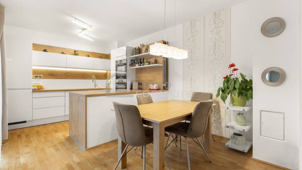 Die Ausstattung umfasst unter anderem Parkett- und Fliesenböden, eine voll ausgestattete Einbauküche sowie Fernwärme als nachhaltige Heizlösung.