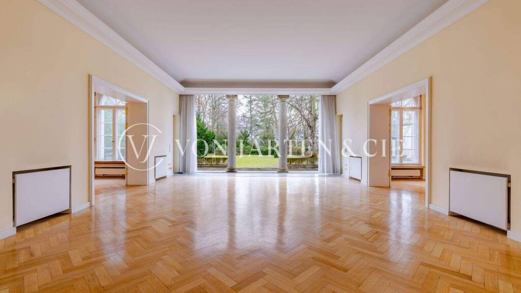 Dabei entstand eine gelungene Verbindung aus historischer Substanz und modernem Wohnkomfort. Im Erdgeschoss der Villa eröffnet sich ein großzügiges Raumangebot mit insgesamt sieben Zimmern und einer Küche. Diese Ebene ist geprägt von charakteristischen Proportionen und vielseitigen Nutzungsmöglichkeiten - sei es als großzügige Wohn-, Ess- und Gästebereiche oder Arbeitszimmer. Die im Rahmen der Sanierung neu geschaffene Raumstruktur sorgt für ein harmonisches und zugleich funktionales Gesamtbild. Das Obergeschoss dient als privater Rückzugsbereich und verfügt über sechs weitere Zimmer sowie fünf Bäder. Die Rückführung der Fassaden auf die ursprüngliche Gestaltung verleiht der Villa ihren klassischen, villentypischen Charakter und unterstreicht die Eleganz des Gebäudes.
