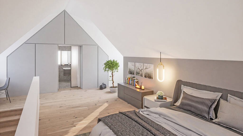 Der Baubeginn ist bereits im September erfolgt! Haus 2 der Gartenvillen (siehe Plan) 120 m2 einladend und eindrucksvoll gestaltete Wohnfläche im Dachgeschoss, bietet diese herrliche, 4,5 Zimmer-Wohnung. Der gekonnt in das Gesamtkonzept integrierte Treppenaufgang in das zweite Dachgeschoss, hat fast schon den Charakter eines Designobjekts und bietet darüber hinaus zusätzlichen Nutzwert, durch den drunterliegenden Abstellraum. Für die Sonnenstunden des Lebens, bietet sich der über 12 m2 große, geschützte Dachbalkon an. Das Gäste Bad ist mit einer bodenebenen Dusche ausgestattet, das Schlafzimmer im 1. Geschoss mit zwei Fenstern, auch hier bietet ein Zimmer einen herrlichen Platz für ein Home-Office. Ein fantastisch geschnittenes Master Schlafzimmer, mit Zugang in das Bad, mit Badewanne und bodenebener Dusche, lassen keine Wünsche offen. Diese Wohnung ist ein Traum.