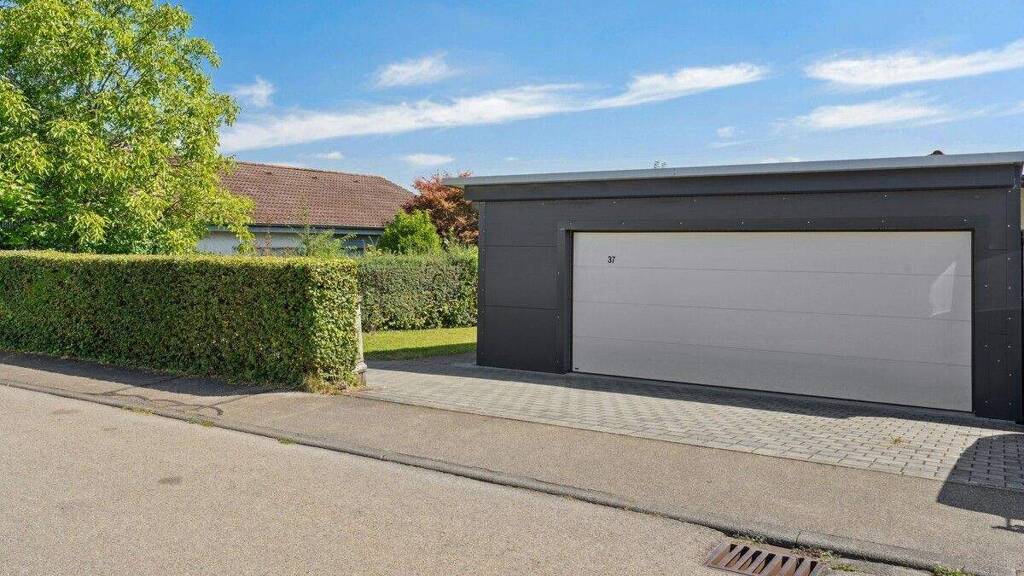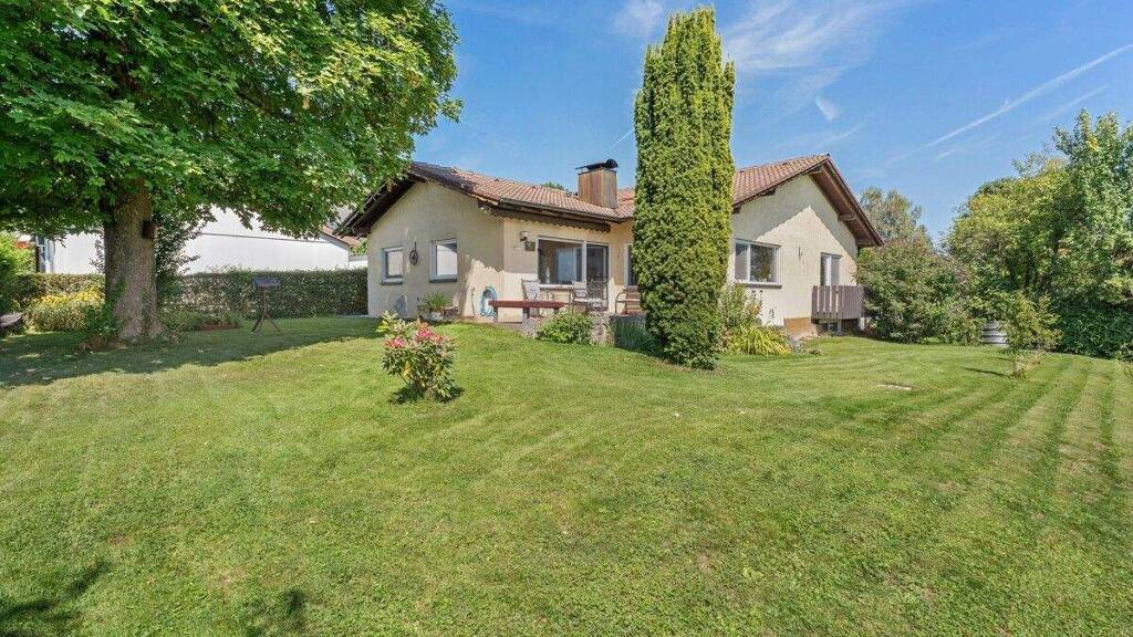 Der Außenbereich umfasst eine Terrasse und einen Balkon in Südostausrichtung - ideal, um den Ausblick zu genießen. Das Haus wurde fortlaufend modernisiert: neue Fenster (dreifach verglast), ein neues Bad, eine neue Küche, eine neu hergerichtete Doppelgarage sowie eine Grundstücksbegrenzung mit Stützmauer. Für behagliche Wärme sorgt ein Kachelofen.