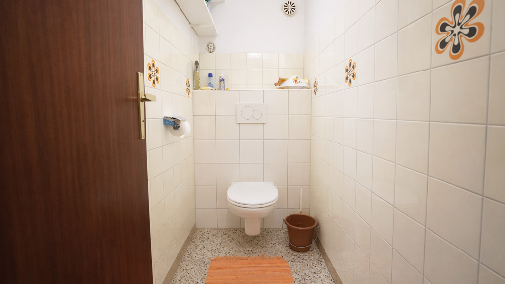 Geradeaus vom Vorraum führt ein kleiner Gang zu einem weiteren Schlafzimmer sowie zum Badezimmer, das mit einer Badewanne ausgestattet ist. Ein separates WC sorgt für zusätzlichen Komfort.