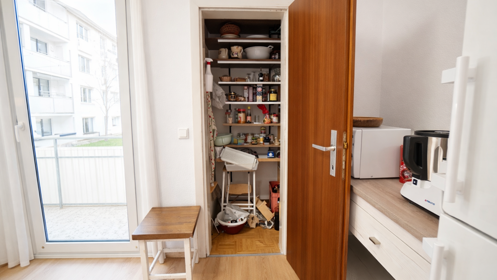 Rechts vom Vorraum befindet sich die Küche, die bereits erneuert wurde und durch ihre Funktionalität überzeugt. Angrenzend steht ein kleiner Abstellraum zur Verfügung, der zusätzlichen Stauraum bietet. Von der Küche aus gelangt man zudem auf die gemütliche Loggia mit ca. 3,56 m² – ideal zum Entspannen im Freien.