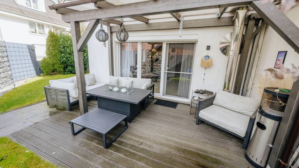 das Grundstück ist pflegeleicht angelegt und bietet mit der überdachten Terrasse einen idealen Ort für entspannte Grillabende.