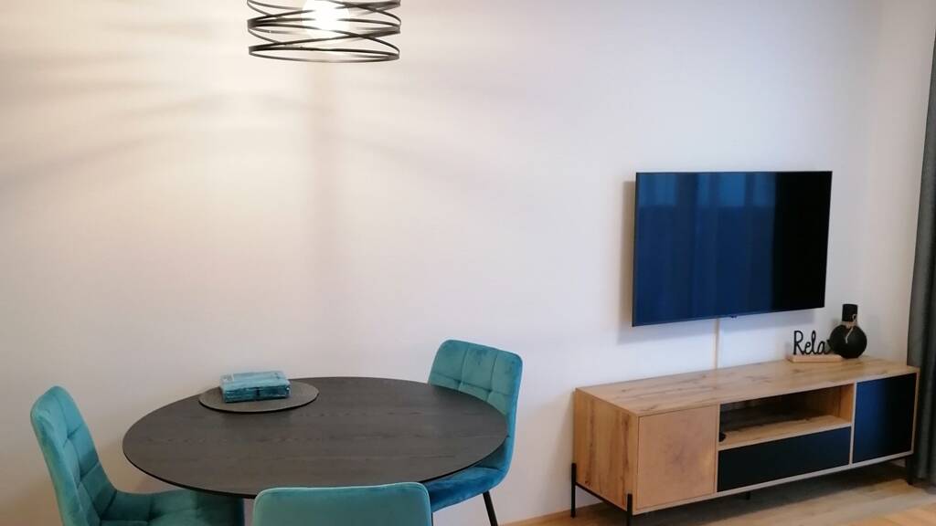 Das Wohnzimmer ist geräumig und verfügt über ein bequemes Schlafsofa, einen Couchtisch und einen 50 Zoll-Smart-Flachbildfernseher mit schnellem Internet, was es zum perfekten Ort macht, um sich nach einem langen Tag zu entspannen und zu erholen. Die Küche ist vollständig mit modernen Geräten ausgestattet, einschließlich Kühlschrank, Herd, Mikrowelle, Geschirrspüler, Kaffeemaschine, Wasserkocher und ausreichend Stauraum für alle Kochbedürfnisse. Es gibt auch einen Esstisch für drei Personen.