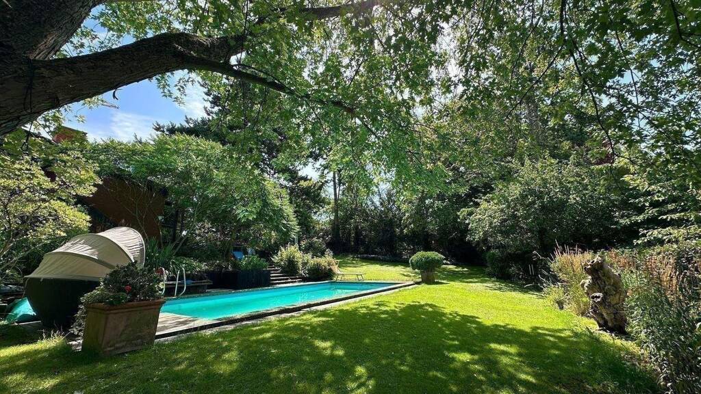 Das Anwesen steht frei auf einem rechteckig geschnittenen Grundstück und ist ideal ausgerichtet. Der Außenbereich ist eine grüne Oase mit altem Baumbestand, geschwungenen Wegen, aufwendig angelegten Beeten und einem großzügigen Poolbereich (beheizter Außenpool). Hier trifft Gartenkunst auf Lebensqualität – und bietet gleichzeitig Privatsphäre pur.