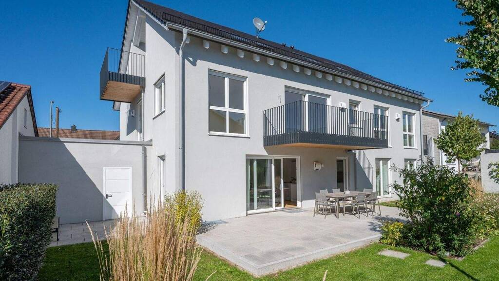 Diese exklusive 4-Zimmer-Wohnung befindet sich in einem modernen Neubau von 2023 und bietet hochwertigen Wohnkomfort im Erstbezug. Die Immobilie überzeugt durch zeitgemäße Architektur und energieeffiziente Bauweise mit einem hervorragenden Energiewert der Klasse A+. Beheizt wird sie über eine umweltfreundliche Wärmepumpe, was sowohl ökologisch als auch wirtschaftlich ist. Im Herzen der Wohnung liegt ein großzügiger Wohn- und Essbereich mit offener Küche, der viel Raum für gemeinsames Leben bietet. Von hier gelangen Sie direkt zum Balkon, welcher zum Entspannen einlädt. Drei gut geschnittene Schlafzimmer bieten vielseitige Nutzungsmöglichkeiten. Das moderne Badezimmer mit bodengleicher Dusche und Badewanne bietet ein stilvolles Ambiente, ein separates Gäste-WC erhöht den Komfort. Besonderen Charme verleiht der edle Eichenparkettboden, der sich harmonisch durch die Wohnräume zieht. Die Fußbodenheizung sorgt stets für angenehmes Klima. Elektrische Rollläden lassen sich - ebenso wie die Heizung - bequem über die Homematic-App steuern und bieten ein smartes Wohngefühl. Zur Wohnung gehören außerdem ein Kellerabteil sowie zwei Außenstellplätze. Mit durchdachtem Grundriss, hochwertiger Ausstattung und smarten Details bietet diese Wohnung ein Zuhause, das funktional und ästhetisch höchsten Ansprüchen gerecht wird.