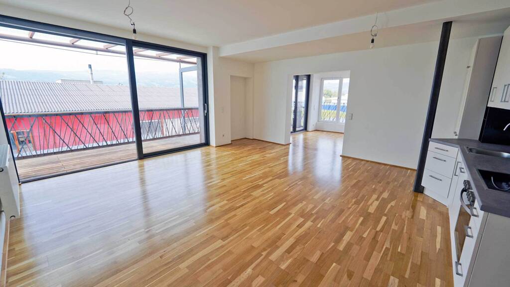 Diese tolle 4-Zimmer-Wohnung bezaubert mit ihrem modernen Charme und ihrer tollen Ausstattung. Der komplett offene und große Wohnbereich lädt zum Entspannen ein, bietet ausreichend Platz für Familie und Freunde, und ist mit großen bodentiefen Fensterportalen ausgestattet. Besonders hervorzuheben ist dabei der Blick auf die Saualpe. Auch die großen Fensterportale lassen dabei den Balkon wie eine Verlängerung des Wohnraums wirken und sorgen so für ein noch angenehmeres Raumgefühl. Die schöne Küche wird jeden Hobbykoch begeistern und ist mit Elektrogeräten für den täglichen Bedarf ausgestattet. Direkt an den Wohnraum grenzt der großzügige (größtenteils) überdachte Balkon. Hier können Sie die Sonnenstrahlen genießen und entspannte Stunden im Freien verbringen.