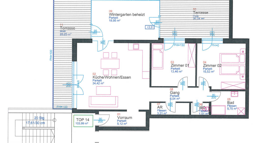 Insgesamt verfügt die Wohnung über 3 Schlafzimmer mit großen bodentiefen Fenstern, welche alle 3 an die XXL Loggia angrenzen. Die Loggia zeigt in den Innenhof der Liegenschaft und bietet ideale Voraussetzungen um sich einen bequemen Rückzugsort zu schaffen. Ausgestattet mit verglasten Schiebeelementen könnte hier ein ganz persönliches und privates Reich gestaltet werden.