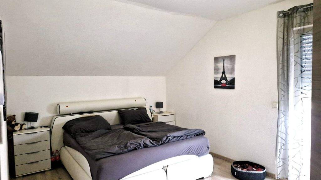 Im Dachgeschoss befinden sich drei gemütliche Schlafzimmer – darunter das Elternschlafzimmer mit begehbarem Kleiderschrank – sowie ein modernes Badezimmer mit ebenerdiger Dusche und einer Badewanne. Eine offene Galerie und hohe Decken schaffen ein angenehmes Raumgefühl.