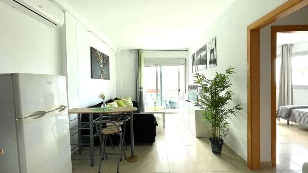 Eingangsbereich hell, Wohnbereich mit Essbereich, kleinen Balkon und Meerblick, Schlafzimmer 1 mit Doppelbett, Schlafzimmer 2