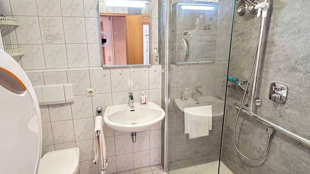 Über einen kleinen Flur gelangen Sie zum Schlafzimmer, dem Kinderzimmer und dem innenliegenden Badezimmer mit neuer bodentiefen Dusche aus dem Jahr 2024.
