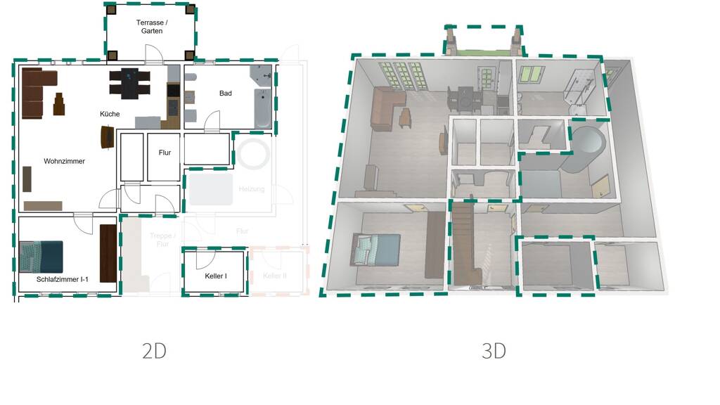 UG: Wohnen, Schlafen, Bad, Flur, Kellerraum, Terrasse