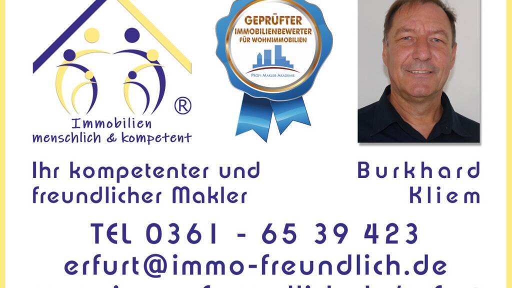 Nehmen Sie dazu bitte Kontakt auf mit Herr Kliem Tel. 0361 65 39 423, mobil 0172 36 26 121 oder erfurt@immo-freundlich.de