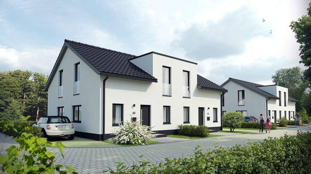 Moderne Grundrisse mit offenem Wohn-/Ess-/Küchenbereich und genehmigter Wohnfläche je Haushälfte von ca. 101 m² (kleine Variante mit weißer Putzfassade) und optional 139 m² (große Variante mit Klinkerfassade und Putzelementen) sehen einen klimafreundlichen Neubau mit Effizienzhaus-Stufe 40 vor. Die hochwertige Lärmschutzwand schließt das neue Baugebiet zum Süden hin vorteilhaft ab.