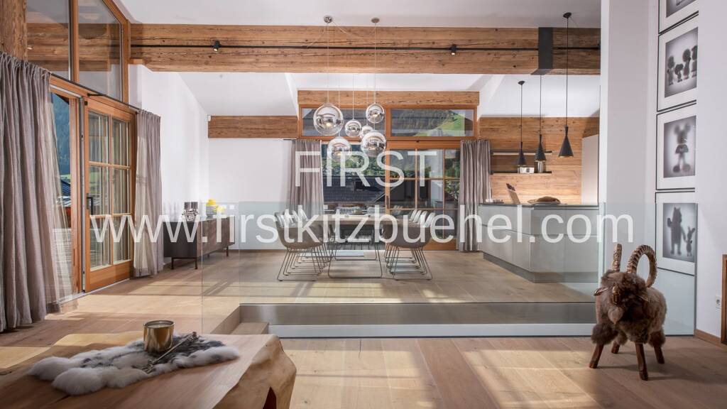 Im Dachgeschoss befindet sich der große, offene und helle Wohn- und Essbereich, welcher von der Stiege räumlich getrennt wird. Auf der einen Seite die Profiküche mit eigener Speisekammer und der Esstisch von wo aus Sie direkt auf den weltberühmten Hahnenkamm blicken und auf der anderen Seite, das Wohnzimmer und das gemütliche Kaminzimmer mit Bar und Kaiserblick. Das dritte Schlafzimmer mit Bad en Suite und Dampfsauna befindet sich ebenfalls im Dachgeschoss.