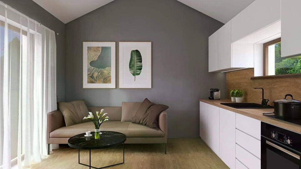 Beim Betreten des Hauses öffnet sich ein heller Eingangsbereich, der direkt in das freundliche Wohnzimmer mit offener Küche führt. Dieser zentrale Wohnraum schafft eine einladende Atmosphäre, in der Kochen, Entspannen und Zusammensein harmonisch ineinander übergehen. Das zusätzliche Schlafzimmer - alternativ ideal als Arbeitszimmer nutzbar - bietet Rückzugsmöglichkeiten und flexible Nutzungsmöglichkeiten, ganz nach Ihren Bedürfnissen.
