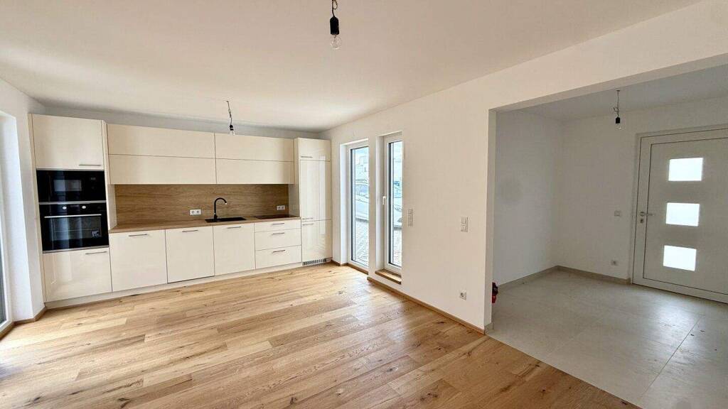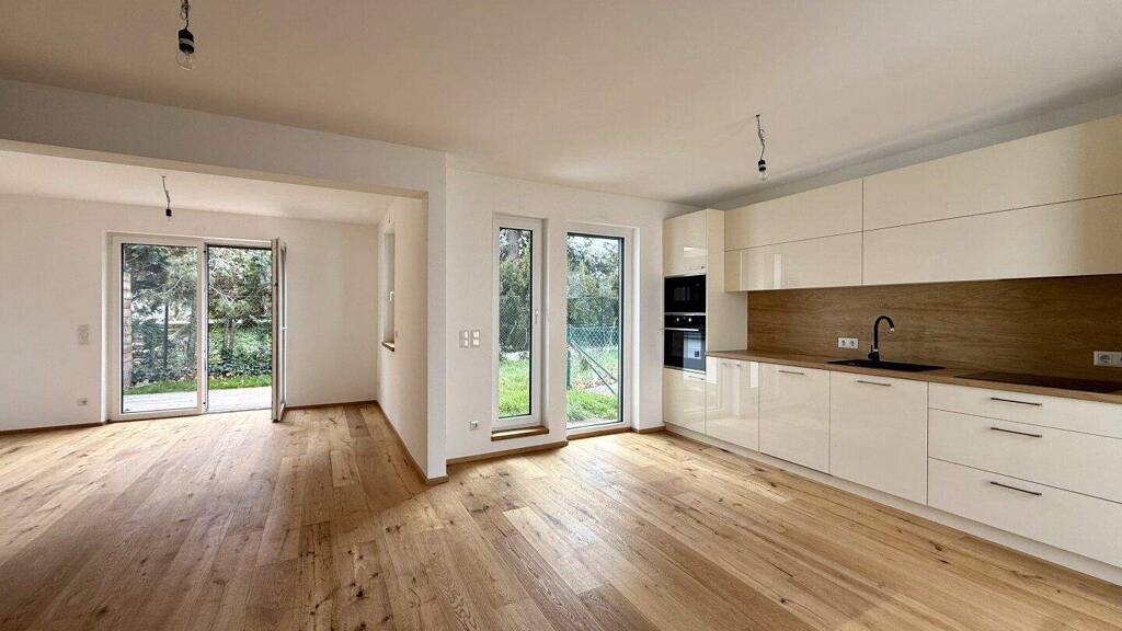 In den Wohn- und Schlafräumen werden hochwertige Eichenparkettböden verlegt worden. Die Nassräume sind mit qualitativen Feinsteinzeugbelägen verfliest worden. Die Heizung erfolgt mittels einer Luftwärmepumpe (Fußbodenheizung). Die Kunststofffenster verfügen über einen integrierten Sonnenschutz. Eine Küche inkl. sämtlicher Geräte ist im Kaufpreis inkludiert. Im Garten ist ein Rollrasen verlegt. Jedem Haus ist ein PKW-Stellplatz zugewiesen.