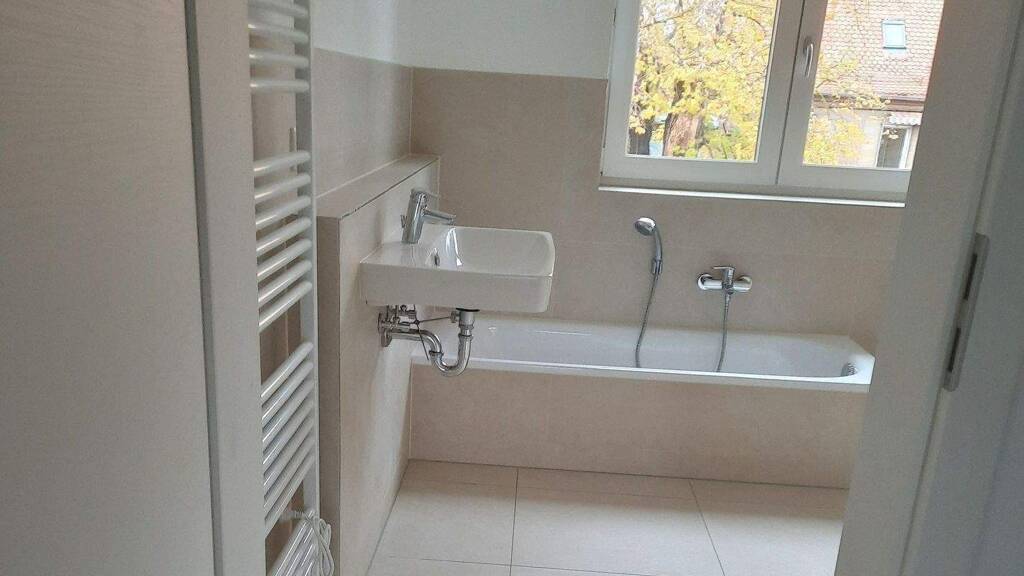 Bad mit Extras: bodengleiche Walk-in-Dusche, Unterputzarmaturen, großes Waschbecken, Badewanne
