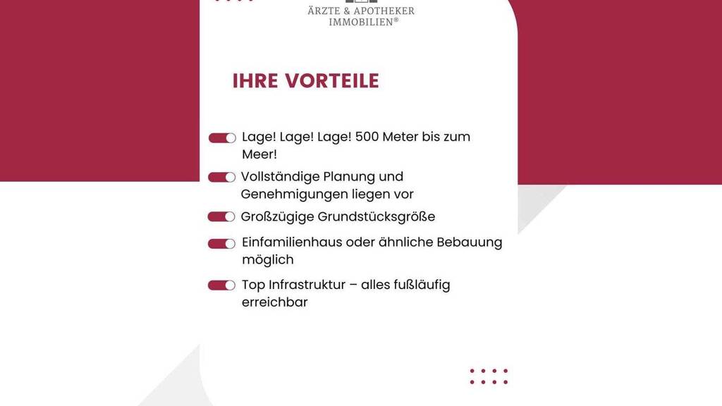 Das von uns angebotene Grundstück in Grömitz ist ca. 532 m² groß und ist aktuell mit einem Altbestand (Einfamilienhaus) bebaut.